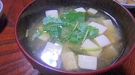 だしをとり、豆腐、わかめ、味噌を加えて一煮たちしたら香りの野菜を散らして火を止める。